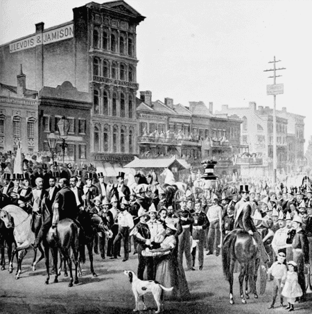 In 1703, Mobile was the capital of French Louisiana, and settlers celebrated the first Mardi Gras in what would become the United States. A few years later, in 1711, the city formed the Boeuf Gras Society, the first mystic society in the country. Later, in 1830, Michael Krafft organized the Cowbellion de Rakin Society, the first formal mystic society parade with floats and costumes.
