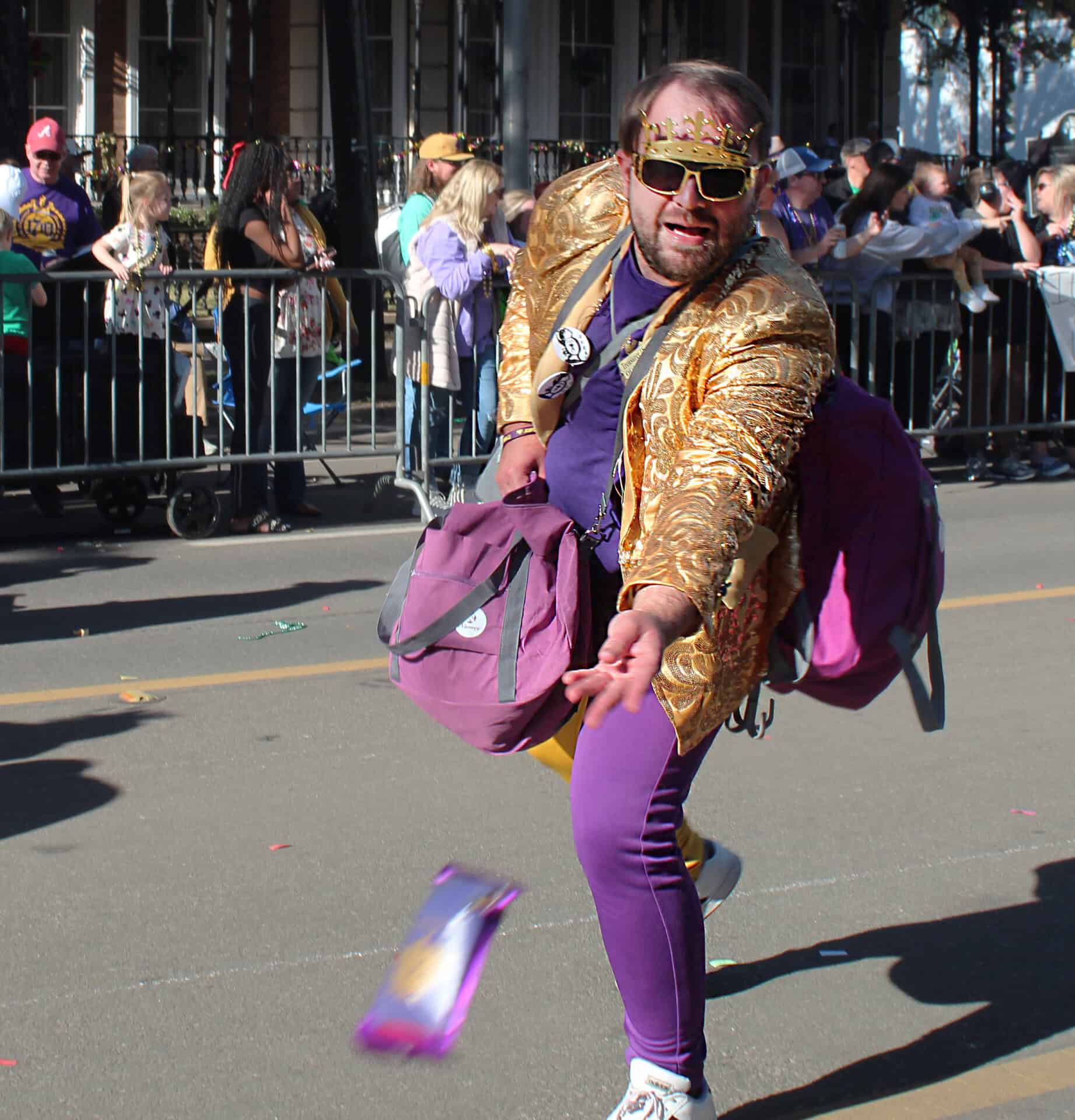 The Joe Cain Procession, often referred to as “The People’s Celebration,” has been a huge part of Mobile Mardi Gras since its humble beginnings in 1967. Nowadays, the procession is in two parts: The Joe Cain Marching Society — those who walk the parade route, often in costume — lead off, and then comes the Joe Cain Parading Society, which includes 35 floats and vehicles, and some more walking groups. Wayne Dean Sr. portrays Slac IV for the 41st year in a row by leading the Marching Society.