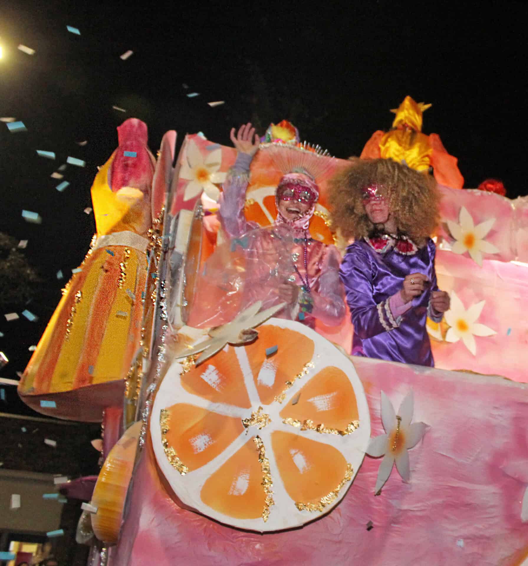 In 2026, their theme is “Country Queens,” as in Reba, Tricia, Shania, Faith, Dolly, Tanya and The Chicks. There are nine floats designed by Sarah Otts and built by Rhonda Odom McCullough. The parade also includes dance groups and marching bands. Costumes are by Seams to Be.