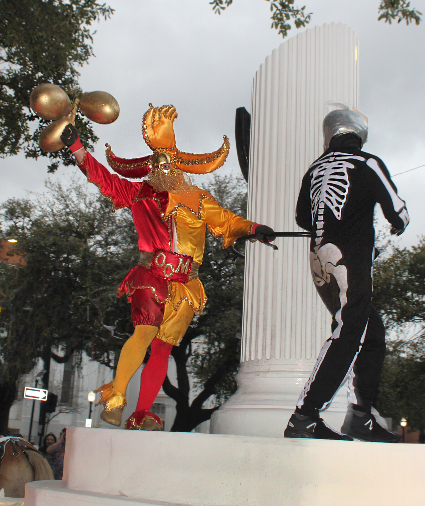 Founded in 1867 and putting on its first parade in 1868, the Order of Myths was Mobile’s first and is the oldest continuous Mardi Gras parading group. OOM always presents the last Mobile parade on Mardi Gras Day, closing the day with a procession that always nods back to the old days. From the beginning, the Order of Myths has always had the same emblem float, a simple affair with a broken column in the middle. Often referred to as the broken column of life, there has been much discussion over the years as to its meaning, including the idea that it’s a reference to the defeated post-war South. Around the column, a member of the group dressed as Death is chased by another member dressed as Folly. As they chase round and round, Folly beats on Death with a bunch of inflated pig bladders painted gold and tied to a piece of broomstick. Yes, they do still use pig bladders, and former Follies have reported that though largely dried by parade day, the gold balloons can have a powerful smell. The float is still pulled by mules and illuminated by flambeaux. The lesson to be taken away from the float is that while Death always beats us eventually, on one day of the year – Mardi Gras – Folly always beats Death.