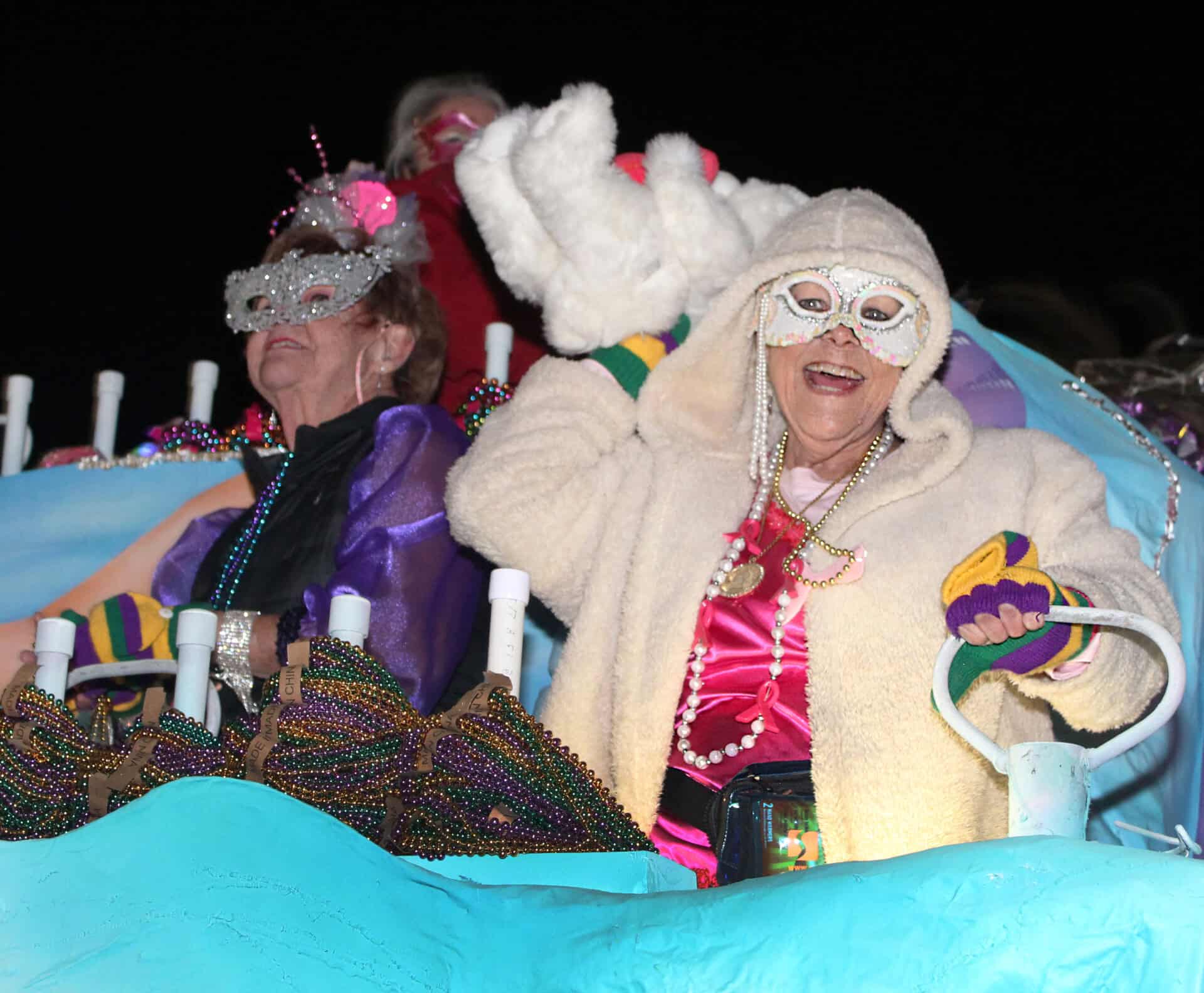 In 2026, their parade theme is “Cocktails and Dreams.” Expect 18 floats, built by Meagan Marler’s Mythic Float Works and designed by Brent Amacker. The parade will also include marching bands, brass bands and Chico the drummer. Queen Dina and Emblem Michelle are escorted by Mark and Greg, respectively. Costumes are by Anita Finch of Seams to Be.
